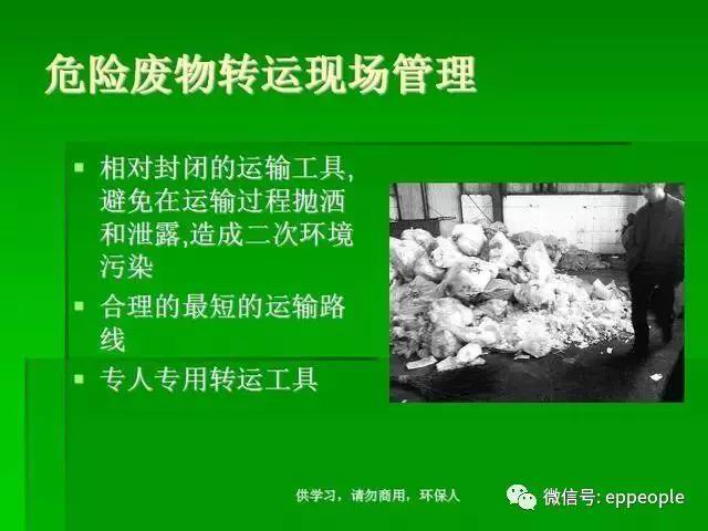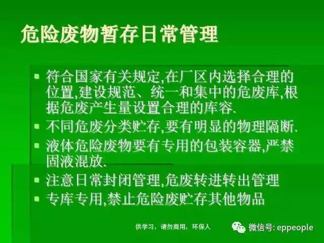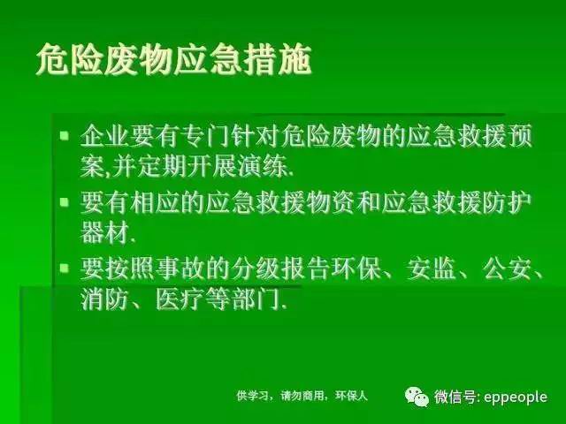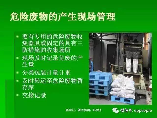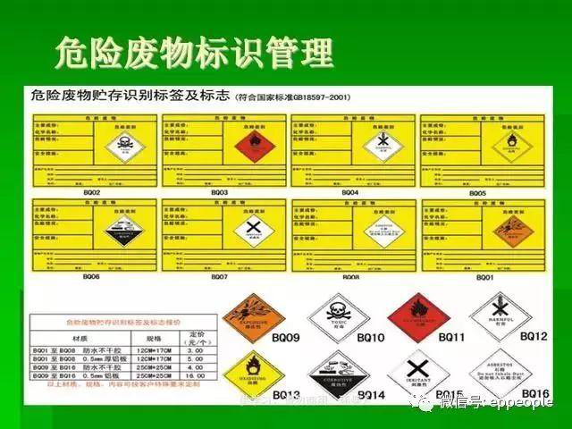 2)危廢收集:危險廢物需要用專門容器,根據成分進行分類收集。危險廢物分類收集必須與綜合利用和處理處置相結合。裝運危險廢物的容器應根據各種危險廢物的不同特性而設計,能有效地防止滲漏、擴散。裝有危險廢物的容器必須貼有標簽,在標簽上詳細標明危險廢物的名稱、重量、成分和特性