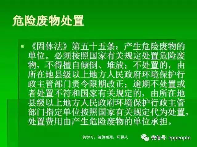 根據國家和地方環保法律法規規定:產生危險廢物單位必須將危險廢物進行集中處理,安排專人負責收集和管理工作,待運危險廢物要設置專門容器儲存,危險廢物必須交有具有相應資格的單位進行收集、運輸、處理和處理。