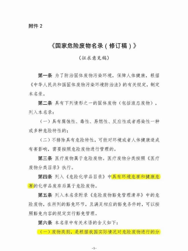 《名錄(修訂稿)》(二次征求意見稿)包括正文、附表《國家危險廢物名錄》、附錄《危險廢物豁免管理清單》。