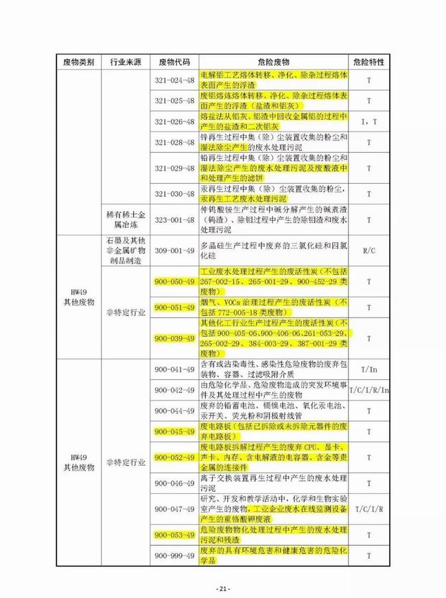 6.修改鋁冶煉相關危險廢物的規定。2016年版《名錄》對鋁冶煉過程產生的危險廢物類型及產生工藝描述不清,本次修訂過程中對鋁冶煉過程中產生的危險廢物進行了重新梳理,調查分析了其危險特性,明確了鋁冶煉過程產生的危險廢物種類及其工藝來源和危險特性。